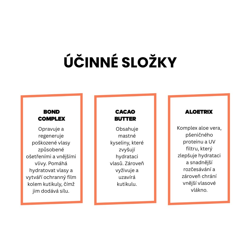 - KAKAOVÉ MASLO – obsahuje mastné kyseliny, ktoré podporujú hydratáciu vlasov, dodávajú výživu a pomáhajú uzatvárať kutikulu.